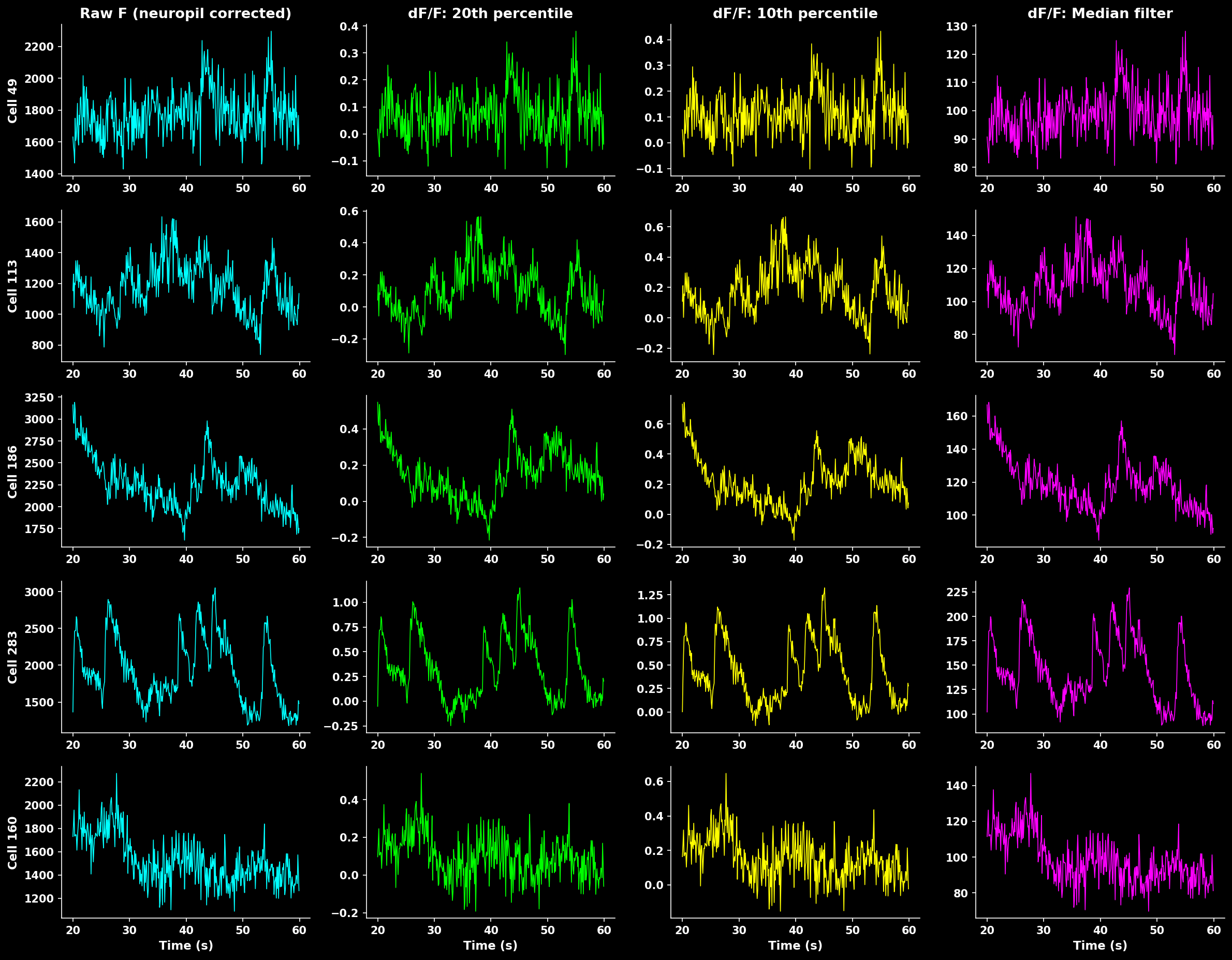 Comparison of different ΔF/F calculation methods. Rolling percentile (20th) provides robust baseline estimation that handles slow drifts while preserving transient peaks.#