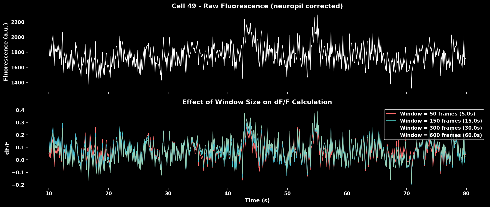 Effect of window size on ΔF/F calculation. Smaller windows track faster baseline changes but may contaminate baseline with transients. Larger windows provide stable baselines but miss slow drifts.#