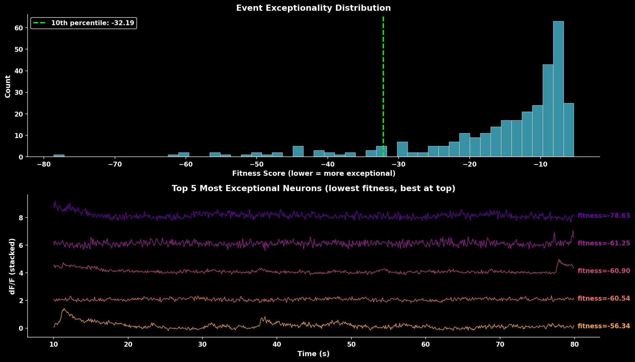 Event exceptionality analysis. The fitness score distribution shows most neurons have moderate exceptionality. Lower fitness scores indicate neurons with rarer, more exceptional events. The trace panel shows the 5 most exceptional neurons (lowest fitness scores) with best-quality neurons displayed at top.#
