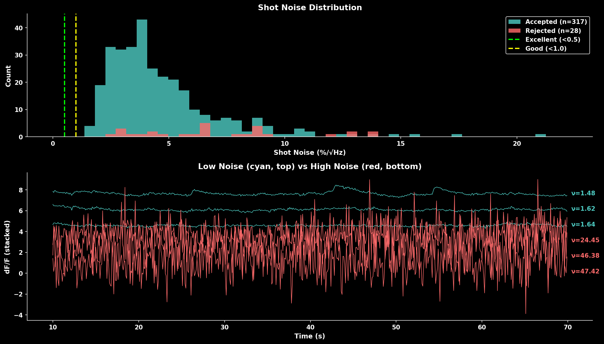 Shot noise distribution comparing accepted vs rejected cells. Lower noise indicates cleaner recordings. The trace panel shows example neurons with low noise (cyan, top) vs high noise (red, bottom).#