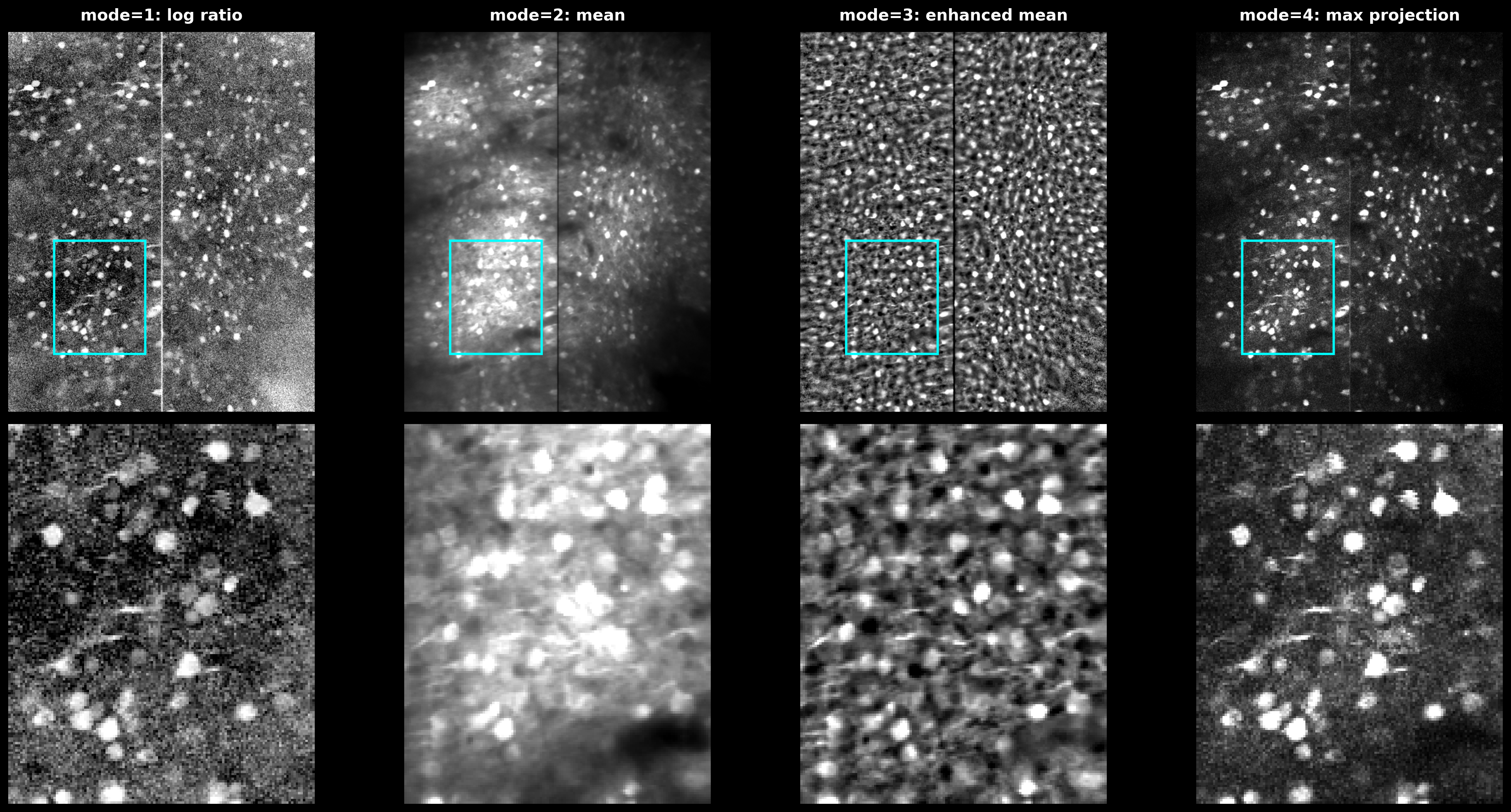Comparison of anatomical detection modes. mode=1: log ratio highlights active regions. mode=2: temporal mean. mode=3: enhanced mean with median filter. mode=4: maximum projection of HP-filtered movie.#