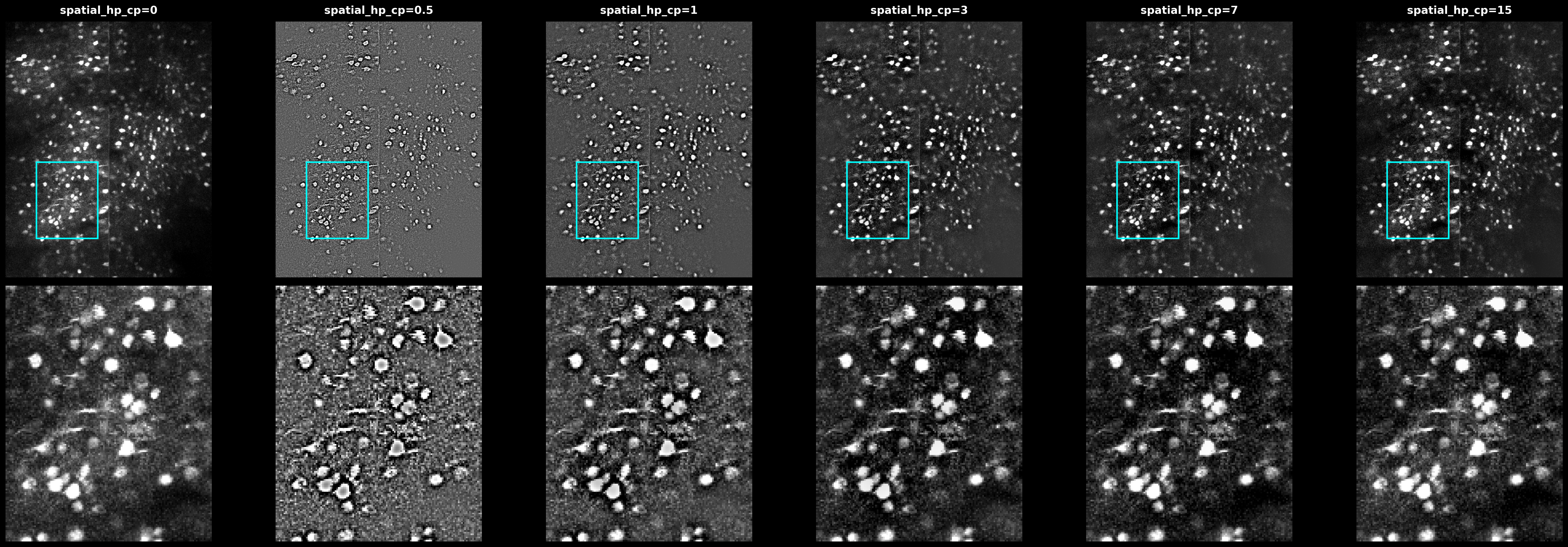 Effect of spatial_hp_cp values on the max projection. Higher values sharpen cell boundaries but may amplify noise.#